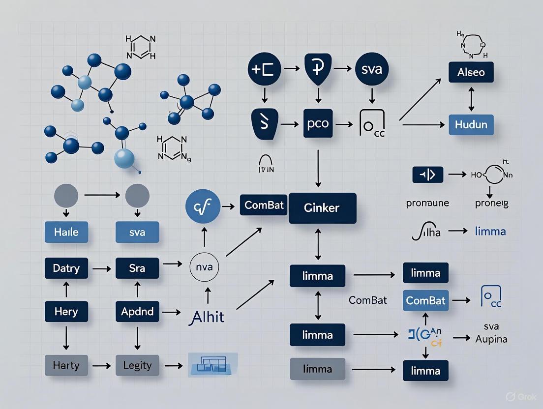 | Sample-Based (Statistical) | ComBat, limma | Empirical Bayes or linear modeling to adjust location/scale per batch. | Bulk genomics (microarray, RNA-seq), when batch info is known, no QC samples. | Assumes most features are not differential across batches; risk of over-correction if biology is confounded. |